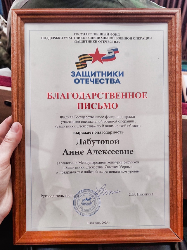 Ее рисунок теперь украшает виртуальную галерею Музея Победы и напечатан в сборнике ветеранов боевых действий СВО Владимирской области. В ходе проведения патриотической акции эти книги были вручены ветеранам боевых действий, которые проводили уроки мужества, и ребятам, участвующим в подготовке сборника